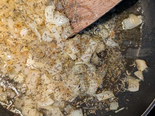 - lépés: A hagymát meghámozzuk és kis kockákra vágjuk. Majd az olivaolajon sóval, borssal és a kakukkfűvel elkezdjük megdínsztelni.