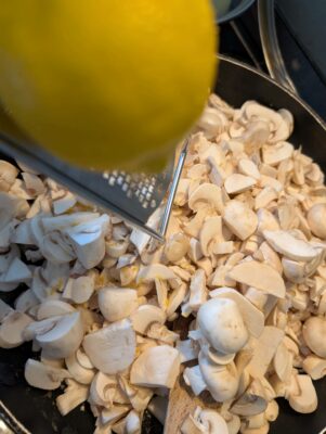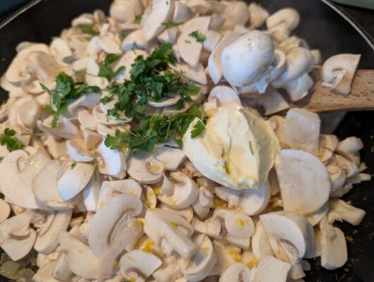 - lépés: Amíg puhul a hagyma, felvágjuk gombát is. Amint üvegesre párolódott a hagyma, a serpenyőbe rakjuk a gombát is.