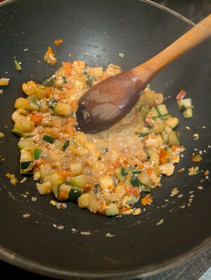 - lépés: Hozzáadjuk a rákot, a cukkinit és a paradicsomot. Hagyjuk, hogy elfője a levét.
