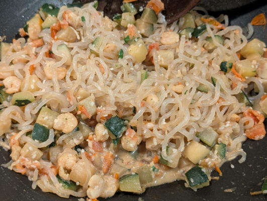- lépés: A shirataki tésztát hozzá forgatjuk a wok tartalmához és hozzáadjuk a szójaszószt is.