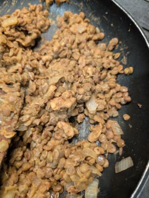 - lépés: A leszűrt lencsét, diót adjuk a hagymához. Ekkor adjuk hozzá a juharszirupot , valamint a curryt is. Addig kevergessük közepes lángon, amíg krémes állagú nem lesz.