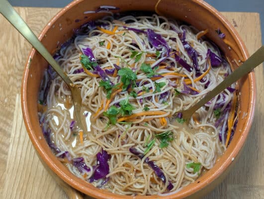 2. lépés: A rizs tésztát megfőzzük a tasakon szereplő leírás szerint. ( Nagyjából 5 perc a főzés idő.)